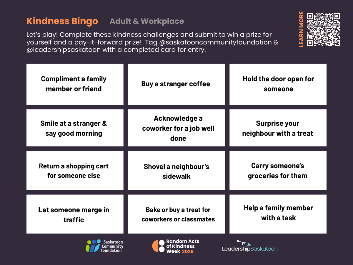 This isn’t just a day on paper, we are really, really excited to share some resources for a fun way to join the kindness movement right here in Saskatoon. We’ve got resources, bingo cards, and prizes! If you are a workplace, school, or organization and would like to participate, please download the media kit here.